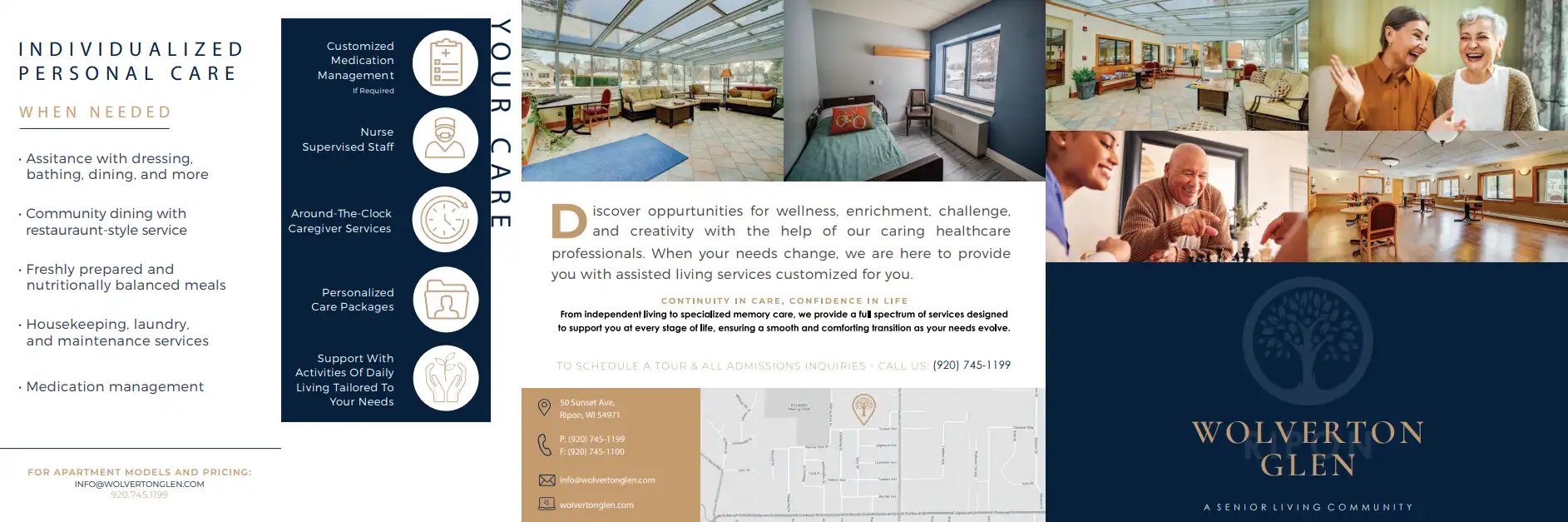 Wolverton Glen is an industry leading assisted living community in the heart of Rapine, WI. Our campus allows each resident to enjoy life to the fullest with the peace of mind that our care team is always there to support them when needed. We cultivate a culture and home-like environment to attract the best healthcare professionals and caregivers to ensure that each resident is treated like family.